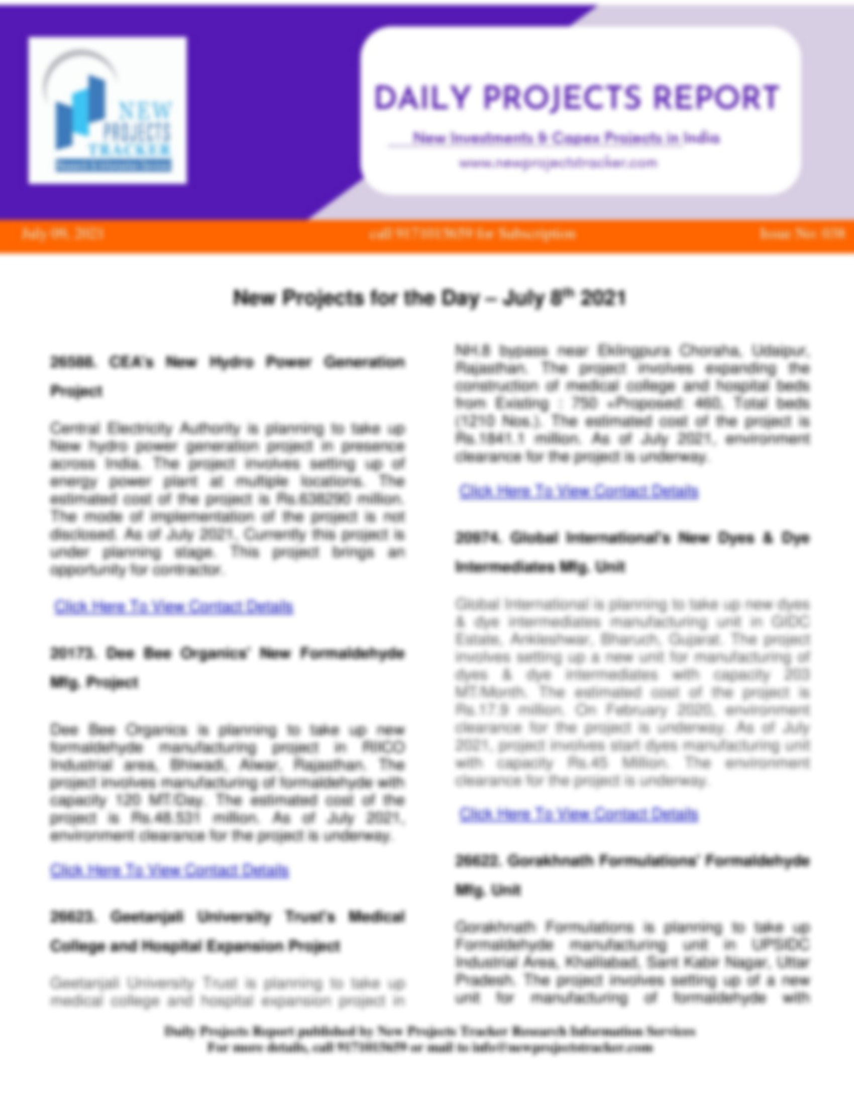 Enrico Pharmaceuticals’ New Pharma Products Mfg. Project Enrico Pharmaceuticals is planning to take up in new pharma products manufacturing project in Industrial Area, Tahliwal, Una, Himachal Pradesh. The project involves establishment of manufacturing…